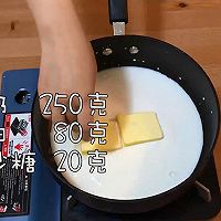 Heat milk, butter and white sugar until boiling.