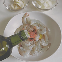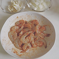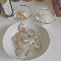 Remove the head, shell, leave the tail, open the back, remove the shrimp line, chop the onion, and slice the garlic