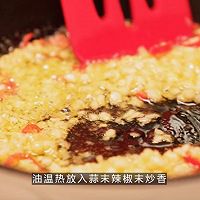 When the oil is warm, add the garlic paste and chopped pepper and stir-fry until fragrant