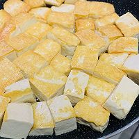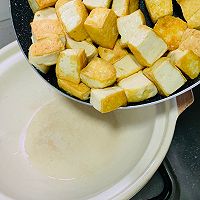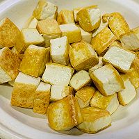 Dried tofu is fried in a non-stick pan until golden brown on all sides, slightly charred and crispy, and the taste is very rich.