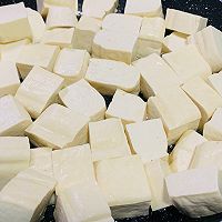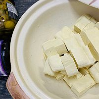 Prepare the ingredients, Spanish green olives, four pieces of dried tofu and cut into mahjong-sized pieces.
