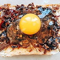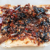Press a groove in the middle of the toast slice and spread a layer of beef sauce,