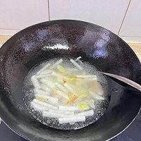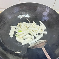 Heat the pan with cold oil and oil to 50%, add chopped green onions and stir-fry until fragrant, add radish strips and stir-fry a few times.