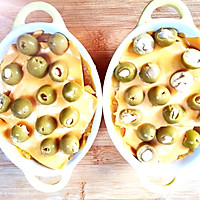 Cover each bowl with two slices of cheese and Spanish olives