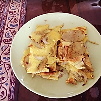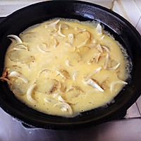 Stir-fry the onion and potato slices until fragrant, add the egg mixture, and over low heat until there is no flowing liquid on the surface