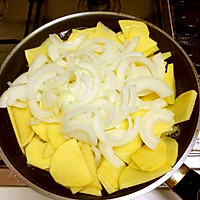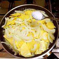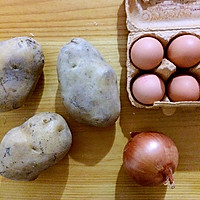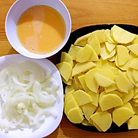Beat the eggs, slice the potatoes and onions, and the potato slices are of moderate thickness, not too thin or too thick.
