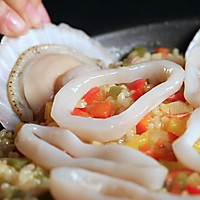 The shrimp is opened and the shrimp line is removed, the emerald mussels are brushed clean, the squid is gutted and cartilage, the red skin is torn off and cut into thick strips or small pieces, and the processed seafood is drained and set aside.