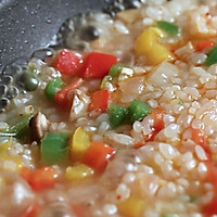Put olive oil in a pan and fry the fragrant onion for 3 minutes over medium heat until translucent, then stir-fry the minced garlic slightly. Stir-fry the tomatoes, bell peppers, and mushrooms for 2 minutes until the tomatoes are slightly soft, then add the rice and stir-fry for 2 minutes.