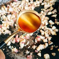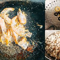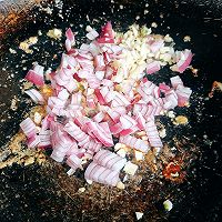 Pick out the shrimp head, control the shrimp oil to retain the remaining oil, pour in the chopped onion and minced garlic and stir-fry until fragrant.