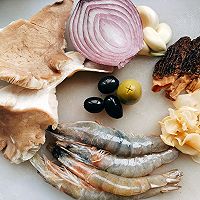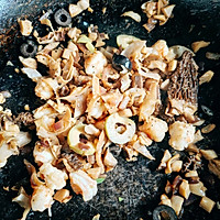 Dice the mushrooms, chop the onion and garlic, soak the morels and white fungus in warm water, cut the Spanish green and black olives into rings, leave the prawns and peel the shrimp,
