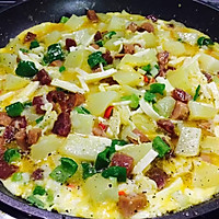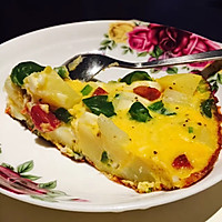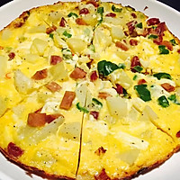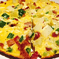 The color and shape are quite similar to pizza, but the texture and taste are the milky aroma of cheese and the egg aroma of whole eggs, as well as the meaty aroma of large ham sausages, the softness of potato cubes, the taste of salt and chopped black pepper, and the crispiness of onions and bell peppers, which are really delicious. This can be used as a staple food, delicious and hungry, and paired with red wine, it is perfect. I hope you enjoy this delicacy as much as I do.