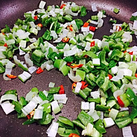 2. Cut the onion and chili pepper (bell pepper) into pieces and stir-fry with a little olive oil for a while. If you like spicy food, you can add a little millet spiciness.