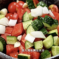 On a summer evening, a bowl of Spanish tomato cold soup is perfect to beat the heat. Cut the tomatoes into cubes, pair them with chopped cucumbers, onions and garlic, sprinkle with sea salt to marinate the juice, throw them all into the food processor, add lemon juice, butter, olive oil and black truffle sauce to puree, wrap the sweet and sour of tomatoes and the mellowness of truffles in the dense and cold, and finally put fried prawns on top, easily reproduce this refreshment at home, one bite, the heat is completely gone.