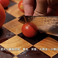 Cut the large and small tomatoes into cubes, remove a small part of the cucumber, onion, and garlic and chop them for later use.