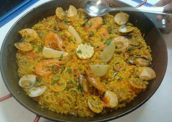 In a special pan of paella, heat olive oil, add monkfish pieces, sprinkle with ground bell pepper, salt, and a little pepper, fry until golden brown on both sides, and serve