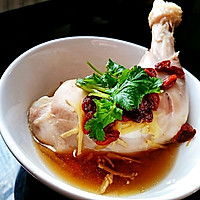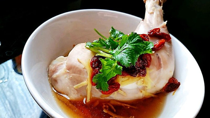 Wash the chicken thighs and salt them before putting them in a bowl. Then add shredded ginger, goji berries and French lang wine, blanch and steam for 20 minutes, and then add coriander to garnish before serving.