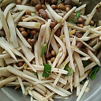 Add cooked peanuts and soybeans, mix in salt, chili powder, vinegar, sesame oil, shredded green onion and ginger, coriander, monosodium glutamate, mix well and serve.