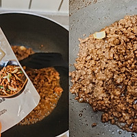 3⃣Slice the garlic, fry the garlic cloves in a frying pan, add the minced beef and stir-fry for a while, add 3 tablespoons of light soy sauce, 1 tablespoon of oyster sauce and a little Korean barbecue seasoning powder, continue to stir-fry evenly and set aside; melt the cheese into a sauce and set aside;