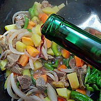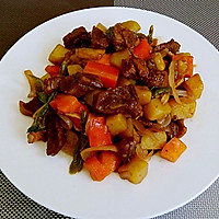 Stir-fry the potatoes, carrots, and onions in a pot, add an appropriate amount of salt, and then pour in the beef and stir-fry together.
