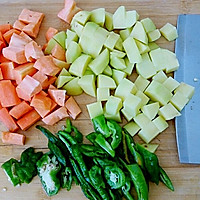 Carrots and potatoes are diced, and peppers are cut into pieces or strips.