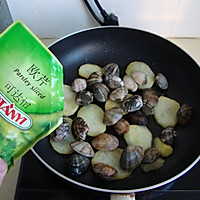 Wash the clams, peel the potatoes and cut them into thicker slices