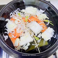 Add cargo cubes, cabbage, shrimp skin, and coriander root to the pot to make a broth