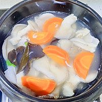 After the broth boils, remove the cabbage, coriander root and kelp, then put the oyster mushrooms, fungus and meat slices into the broth and turn to low heat and cook slowly.