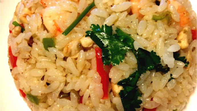 Put vegetable oil in the pot, add diced chicken, then add chopped wild peppercorns, then put green and red peppers, stir-fry, add shrimp, then rice, stir-fry evenly, add fish sauce, then season salt, pepper, sugar, and finally add some lemon juice and coriander to the pot