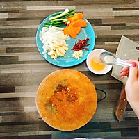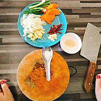 Small corn, onion, carrot, dried chili pepper are all sliced, green onions cut into sections, and garlic is minced