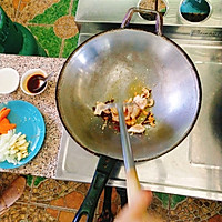 Wait until the surface of the chicken turns white, pour all the remaining ingredients (except the dressing) into the pan and stir-fry.