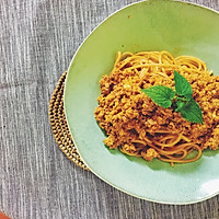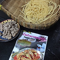Pasta with some salt and cook first! Stir-fry the minced meat with oil and salt! Then take an empty pot and put half a pack of seasoning (Thai Nyonya curry), add appropriate water to make the soup, add all the ingredients at this time, and put the cut garlic cloves together will be very fragrant! When the soup is almost dry, break the eggs, add them to the ingredients and stir together, and that’s it!