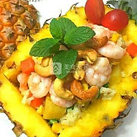 1. The first step is to cut off the leaves of the pineapple head, because the leaves have zigzag edges, and it is easy to cut your hands during the process of handling pineapple. 2. Turn the pineapple across and cut it in a third. 3. Use a smaller knife to cut a square shape on the edge of the pineapple, make a tic-tac-toe shape inside, and remove the pulp with a spoon. 4. After digging, soak the pineapple in salt water and set it aside to dry for later use. 5. Prepare the ingredients, the shrimp is salted in advance to ensure that the meat is firm. Green beans, carrot kernels, corn kernels should be scalded with water beforehand. Sauté the cashew nuts over low heat until fragrant and set aside. 6. Pour the eggs into the pan, and set aside as soon as they solidify. Then fry the rice and pour in the eggs. Add bacon kernels, green beans, cargo kernels, corn kernels. Stir-fry, add Thai curry, salt, and pour in a little coconut milk and fish sauce. When the rice grains absorb water and become distinct, finally add pineapple and shrimp. Finally, add a little chicken essence to taste! 7. Put the rice in the pineapple bowl. 8. Finally, put cashew nuts and garnishes, and the fragrant and sweet and sour Thai pineapple paella is complete.