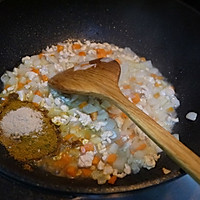 Add curry powder, spices and salt and continue to stir-fry, simmer.