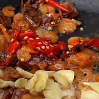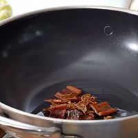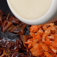 Stir-fry the dried squid until fragrant and then pour in the dried shrimp