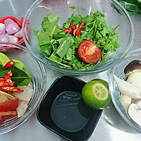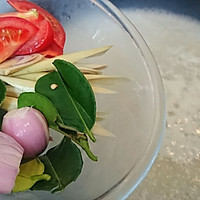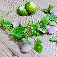 【Side dishes and ingredients】Shiitake mushrooms and agaricus mushrooms, sliced. Cut lemongrass diagonally, cut 3 slices of galangal, rinse 6 lemon leaves, 4 diagonal circles of Chaotian pepper (leave 1 decoration), 2 cherry tomatoes (leave one decoration), and everything four. 2 shallots. Cut coriander and saw coriander into 2cm wide cuts. Squeeze the lime into lemon juice.