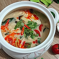 Thai food: coconut milk tom yum – matsutake mushroom chicken soup – slightly sour and spicy – peach love nutritionist private kitchen