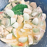 Here is a photo leaked~ Let me describe it 1. First pour the coconut milk and curry into the pot and mix it 2. Fry the chicken nuggets in another pot and stir-fry them for 5 minutes. 3. Pour the chicken nuggets into the curry, cook for 5 minutes, then add lemongrass, a part of the millet spicy, and lemon leaves 4. Add the eggplant after a few minutes