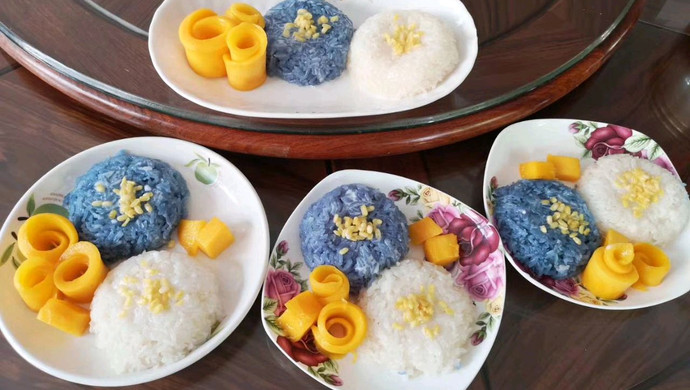 Finally, shape the steamed glutinous rice while it is hot, put it on a plate, add mango, drizzle with the coconut milk prepared before, and finally sprinkle with fried mung bean kernels, done, let’s eat!
