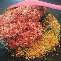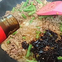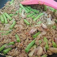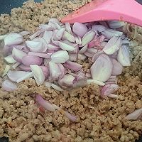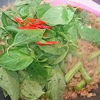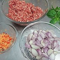 To marinate the minced meat, first add cooking wine and white pepper, remove the fishy smell, and stir well. Then add fish sauce and sugar to taste and whip vigorously. Peel the green onions and wash and shred. Wash the basil leaves, remove the stems, and only the leaves.
