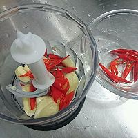Wash the red peppers, remove the seeds, cut 2 red peppers diagonally into circles for later use, put 3 red peppers and 6 garlic cloves into a food processor and beat into minced.