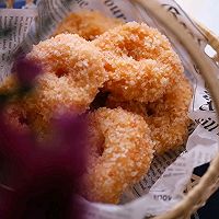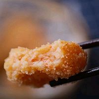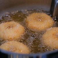 Knead it into a cake shape, leave a small hole in the middle, stick the egg liquid and breadcrumbs on both sides in turn, and fry slowly in a pot at low temperature