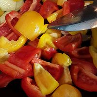 Heat the oil again, heat the oil, stir-fry the ginger slices and onions over high heat, add the bell peppers and continue to stir-fry for about a minute