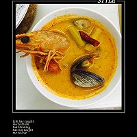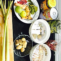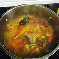 1. Continue to add tom yum sauce and tomatoes and cook for about 3 minutes. 2. Add clams, prawns and straw mushrooms and cook for another 4 minutes. 3. Then reduce the heat to low, add coconut milk, and lime juice, add the lime without slicing, just add the lemon juice, because the Thai lime seeds and skin are bitter, cook for another 2 minutes.