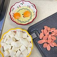 Ingredient preparation: dice steamed buns, slice ham, beat eggs