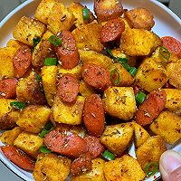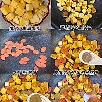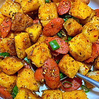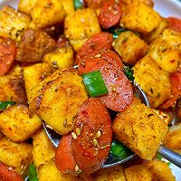 1⃣Pour the egg liquid into the bowl, and the steamed buns are filled with egg liquid 2⃣Heat the oil in the pot and fry the diced steamed buns until golden brown, fry the ham slightly yellow, and stir-fry the diced steamed buns; Add half a spoonful of cumin powder, half a tablespoon of cumin grains, half a tablespoon of chili powder, add a little salt to taste, and stir evenly