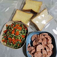 Prepare three slices of toast bread, cut the ham sausage into slices, blanch the sweet green beans and diced carrots for two minutes in advance, remove and cool quickly, control the water and set aside!