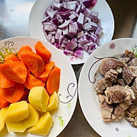 Dice the onion, cut the carrots and potatoes into hob pieces, and remove the blanched brisket for later use