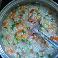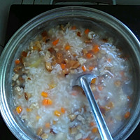 Put the fried vegetables in the porridge, stir well and continue to cook over low heat.