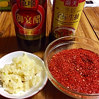 Prepare the dipping sauce, chili noodles, minced garlic, light soy sauce, vinegar, salt. In a small bowl, put two spoons of chili noodles and the same amount of minced garlic, pour in the boiling hot oil, stir well, pour in the light soy sauce, vinegar and salt, and finally add some water.