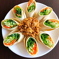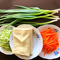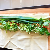 Spread the dried tofu flat on the chopping board and roll up the green onions, shredded carrots, shredded cucumbers, and coriander.